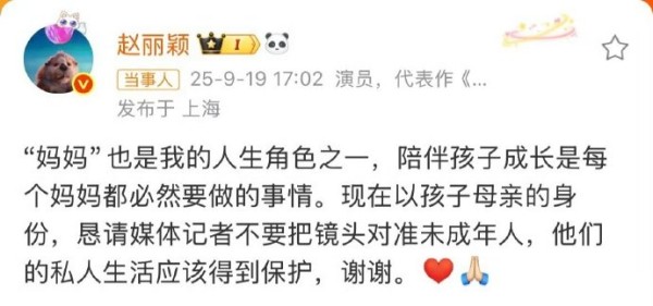 #赵丽颖恳请媒体不要镜头对准未成年人# 赵丽颖发文回应了今天的热搜:“现在以孩子母亲的身份,恳请媒体记者不要把镜头对准未成年人,他们的私人生活应该得到保护,谢谢。