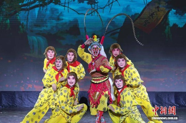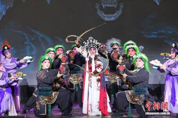当地时间9月23日晚,“国家瑰宝·婺韵流芳”浙江婺剧团印度尼西亚雅加达专场演出举行。折子戏《吕布试马》《天女散花》《三岔口》依次登场,其中《三打白骨精》系首次在雅加达舞台亮相。婺剧俗称金华戏,流行于浙江金华及周边地区,被誉为徽戏“活化石”,2008年入选中国国家级非物质文化遗产名录。图为压轴亮相的《三打白骨精》。中新社记者 李志全 摄