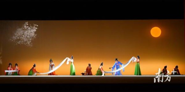 文化周展现了艺术风格浓郁的在地性。越过蜿蜒起伏的五岭山脉,岭南文化艺术如同亚热带炎热阳光普照下的木棉、紫荆、三角梅……奇花异卉,花团锦簇。粤剧《双绣缘》声腔委婉细腻,与高胡相得益彰地对女主南海少女卢眉娘的内心进行了抒发,通过全息投影的唯美呈现,再现了唐代名画《捣练图》空灵简洁的诗意画境。在文化周期间献演的多个剧目灵感都来自和岭南繁花一般绚丽多姿的非遗,如《双绣缘》中的广绣,芭蕾舞剧《家园》中的粤剧、南拳、舞龙舞狮、英歌等。舞剧《英歌》以非遗英歌为纽带,以广东华侨文化为背景,借由父与子的悲欢离合,讲述家国情怀,绽放非遗风采,展现了犹如亚热带气候与植被一般色彩明丽鲜艳的艺术特色。