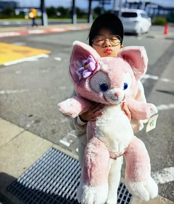 “醒醒”站在路边让母亲拍照,她怀中抱着为宋雨琦准备的毛绒玩偶,这时“醒醒”还佩戴上眼镜,看起来很有学识的样子。