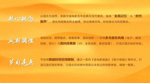 党的二十届四中全会提出,“激发全民族文化创新创造活力,繁荣发展社会主义文化,大力繁荣文化事业,加快发展文化产业,提升中华文明传播力影响力”。120年光辉历程,不仅是经典与传承,更满载青春与活力。电影频道将整合国家级专业媒体平台资源,特别邀请重磅实力电影人、音乐人,串联中国电影百廿经典与当代潮流,以顶级阵容、“封神”舞美与“炸场”创意为源泉,“全民记忆”与“时代新声”交相辉映,唱响跨越时代的电影金曲与动人旋律,继“湾区升明月”后打造又一全新电影盛会爆款品牌。
