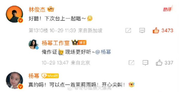 #林俊杰回复杨幂工作室#视频中杨幂手持话筒即兴清唱林俊杰的经典歌曲《一千年以后》,并俏皮互动喊话“山顶的朋友们”。