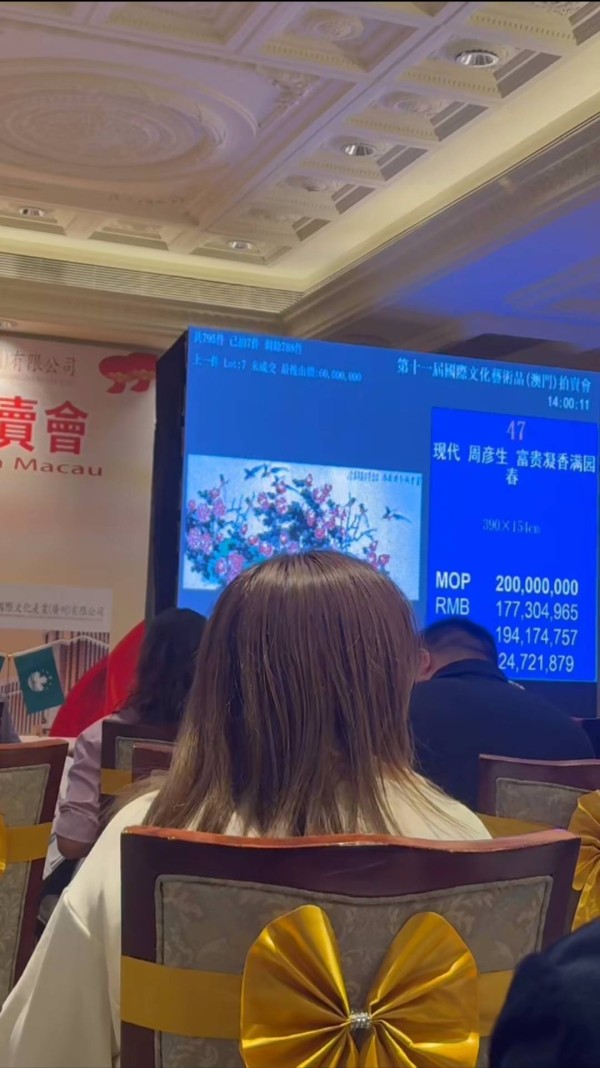 2025年10月28日,周彦生巨幅国画《富贵凝香满园春》(154cm×390cm)在澳门以2亿澳门元成交。