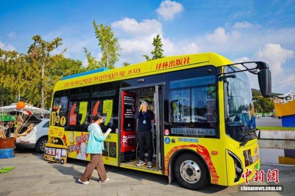 10月31日,第三届南京文学书集开幕式暨“书香润校园”全民阅读活动公益捐赠仪式在南京玄武湖畔金陵STYLE浪漫中心举行,国内80余家顶尖出版机构、20余位知名作家及教育界代表汇聚一堂,共同开启一场全民阅读盛宴。据了解,自2019年南京入选“文学之都”以来,文学书集已成为推动城市文化品牌建设的重要载体,通过“可逛、可玩、可带走”的体验,让经典阅读融入百姓日常生活。图为市民走进“诺奖文学大巴”。中新社记者 泱波 摄