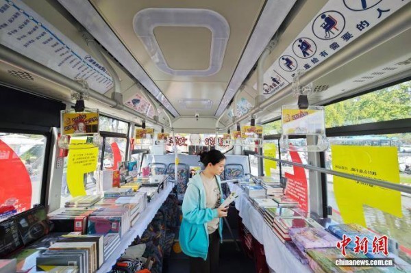 10月31日,第三届南京文学书集开幕式暨“书香润校园”全民阅读活动公益捐赠仪式在南京玄武湖畔金陵STYLE浪漫中心举行,国内80余家顶尖出版机构、20余位知名作家及教育界代表汇聚一堂,共同开启一场全民阅读盛宴。据了解,自2019年南京入选“文学之都”以来,文学书集已成为推动城市文化品牌建设的重要载体,通过“可逛、可玩、可带走”的体验,让经典阅读融入百姓日常生活。图为市民在“诺奖文学大巴”内选购书籍。中新社记者 泱波 摄