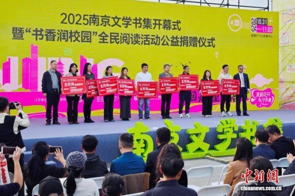 10月31日,第三届南京文学书集开幕式暨“书香润校园”全民阅读活动公益捐赠仪式在南京玄武湖畔金陵STYLE浪漫中心举行,国内80余家顶尖出版机构、20余位知名作家及教育界代表汇聚一堂,共同开启一场全民阅读盛宴。据了解,自2019年南京入选“文学之都”以来,文学书集已成为推动城市文化品牌建设的重要载体,通过“可逛、可玩、可带走”的体验,让经典阅读融入百姓日常生活。图为“书香润校园”全民阅读活动公益捐赠仪式。中新社记者 泱波 摄