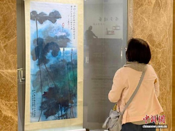 11月4日,于右任、徐悲鸿、张大千等名家书画台北展出。图为观众驻足欣赏张大千画作《泼彩荷花》。中新社记者 朱贺 摄