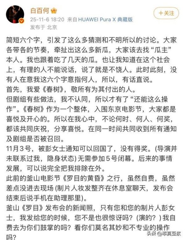 今年东京更狠,11月3日,《春树》入围主竞赛单元。白百何穿着高定礼服飞赴东京,结果被制片人彭瑾一个电话打回原形:“没得奖就滚回去吧!”