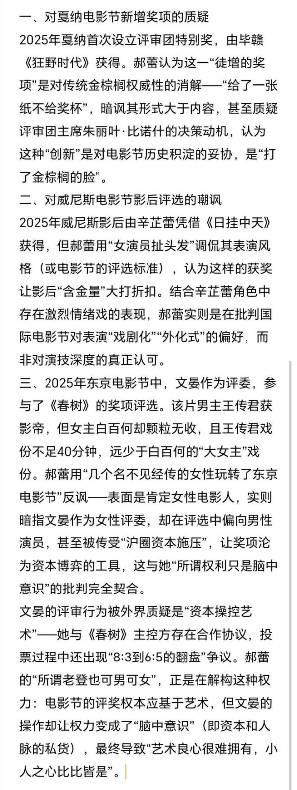 郝蕾用“名不见经传的几个女性玩转东京电影节”反讽了,表面是肯定女性电影人,实则暗指文晏作为女性评委,却在评选中偏向男性演员,甚至被传受“沪圈资本施压”,让奖项沦为资本博弈的工具,这与她“所谓权利只是脑中意识”的批判完全契合。文晏已经否认这种说法,不认识沪圈资本,也没有投过她的电影。