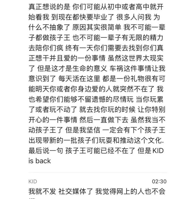 据悉,一个月前孩子王被传在美国因车祸去世,有知情人士透露,当时孩子王的母亲已在个人朋友圈发布了相关讣告。