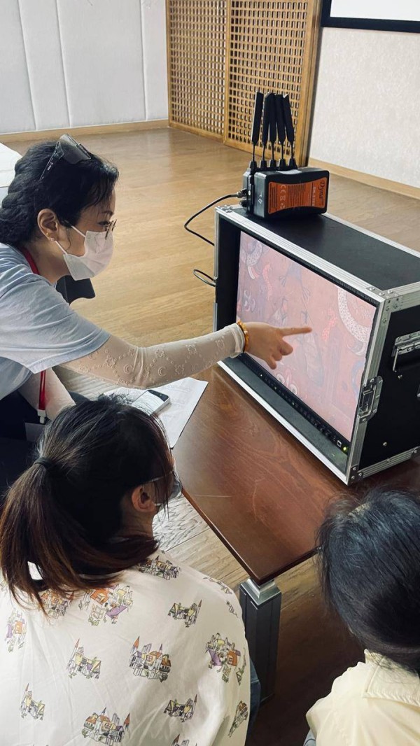 ▲图为T形帛画拍摄现场制片人、总导演曹怡佳在监控器后查看拍摄细节