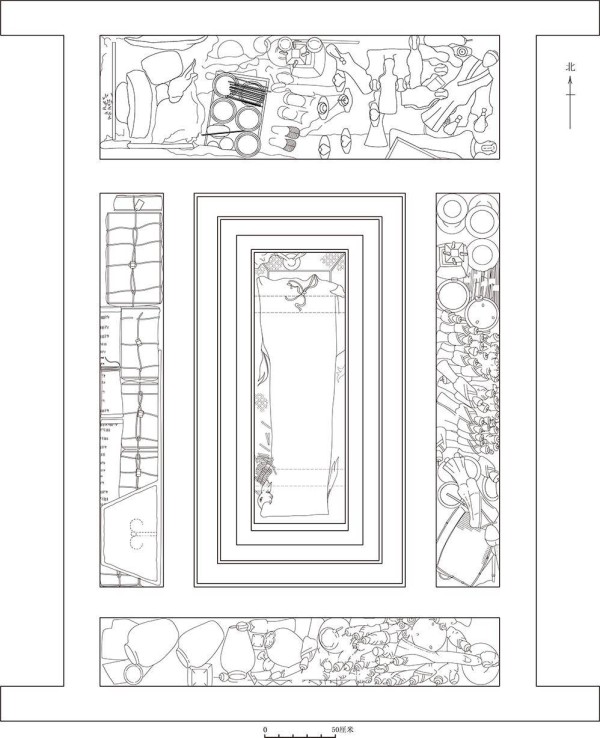 ▲手绘马王堆一号墓木椁出土情形分层线描图