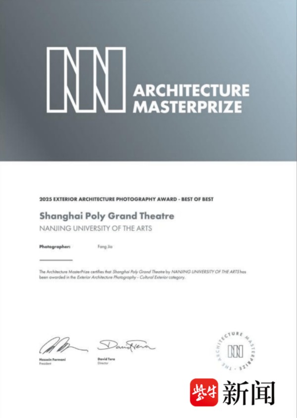 日前,2025年美国建筑大师奖(Architecture Master Prize)简称 AMP)组委会公布了获奖名单。本届建筑摄影类获奖者名单共分为建筑外观与建筑室内两大类别,每个获奖类别包括“最佳杰出奖(Best of Best)”,“优胜奖(Winner)”,“荣誉提名奖(Honorable Mention)”。南京艺术学院传媒学院摄影系贾方老师主持的“上海保利大剧院”建筑摄影项目,荣获2025年AMP美国建筑大师奖“建筑摄影类-文化建筑外观”组别最高奖“最佳杰出奖(Best of Best)”。
