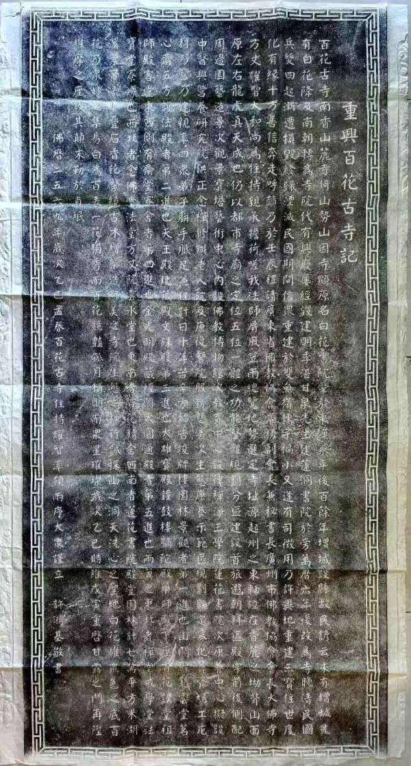 而当一纸素拓从碑身被轻轻揭下,一个黑白分明、意蕴无穷的艺术世界便随之诞生。拓件,是石碑生命的平面延伸与广泛传播的使者。一幅上佳的拓片,不仅能毫厘不爽地清晰反映字口形态,更能传达出原碑石质特有的肌理与整体精神气质。《重兴百花古寺记》的拓件,墨色匀净古雅,字口清晰爽利,将许鸿基书法笔力的沉雄与刻工刀法的精准展现无遗。尤为难得的是,优质的拓片能完美捕捉石碑历经斧凿后留存于表面的独特质感——那绝非光洁无痕的呆板平面,而是凝结着书家落笔时的凝神沉思、刻工运刀时的专注呼吸,以及古寺重光时那份集体虔敬与喜悦的、有温度的历史痕迹。透过这一纸浸润着墨香的拓片,观者仿佛能跨越时空,触摸到艺术创作过程中所有细腻的情感与蓬勃的力量。