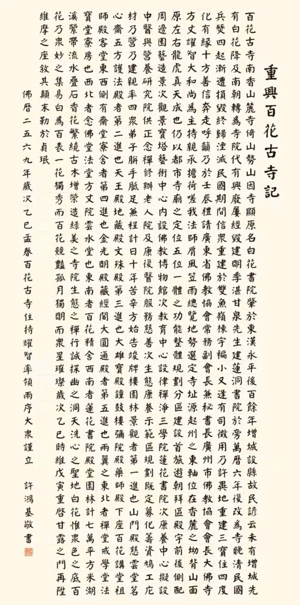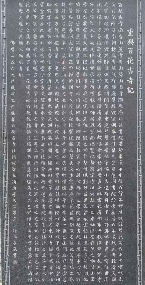 岭南的二月,春和景明,千祥云集。在广州市增城区百花古寺大雄宝殿左前方,一方新立的石碑悄然矗立。碑身青黑,石质温润,其上字迹厚重朴茂,似与这千年古刹的呼吸同频。这便是中国书协原理事、广东省书协原副主席、省文史馆书画院副院长、广州市书协原主席许鸿基先生所书丹的《重兴百花古寺记》。此碑并非寻常书家题额,而是一篇记述寺院重光始末的完整碑记,其书写、镌刻与最终的拓件,共同构成了一部无声却雄浑的“石上交响”。这不仅是岭南书法艺术的一次集中展现,更是对盛唐书法气象的深情回望与创造性转化,蕴含着丰富的文化意义与实用功能。