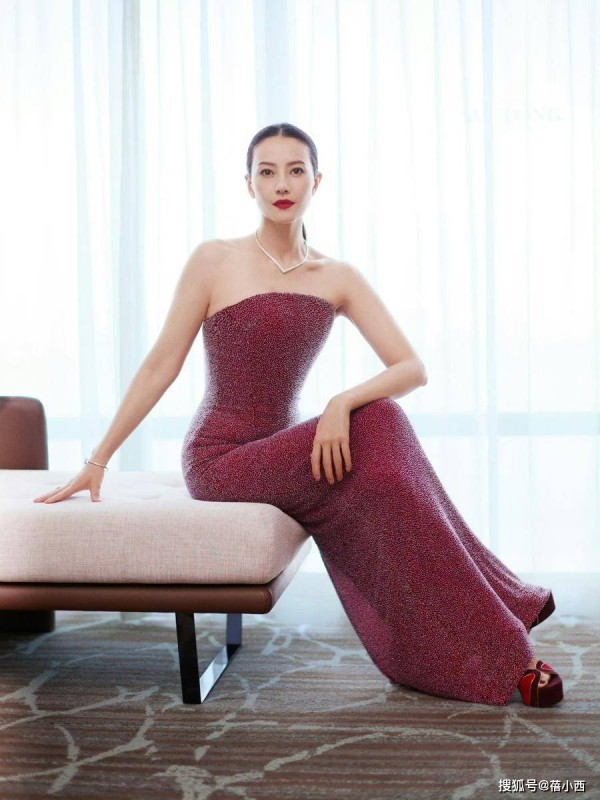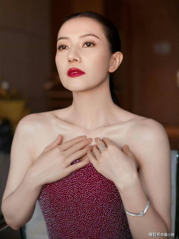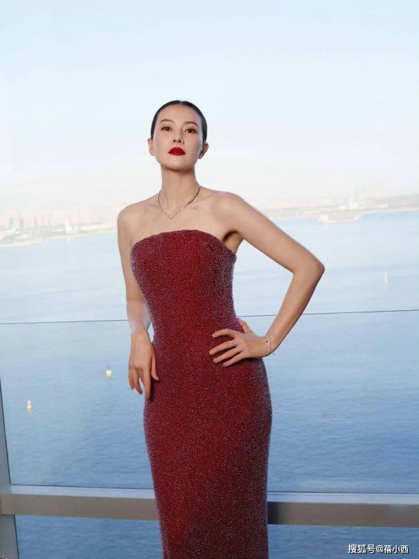 如果说金色亮片裙是气场全开的女王,那这套酒红色抹胸紧身裙就是温柔妩媚的女神,将高圆圆的温婉气质展现得淋漓尽致。酒红色本身就是极具氛围感的颜色,浓郁又高级,不挑肤色,还能衬得皮肤白皙透亮,自带一种复古又温柔的韵味。抹胸的设计大胆又精致,完美露出肩颈和锁骨线条,将上半身的优势展现得恰到好处,抹胸边缘的细腻剪裁,贴合身形却不紧绷,避免了走光的尴尬,同时也修饰了胸部线条。