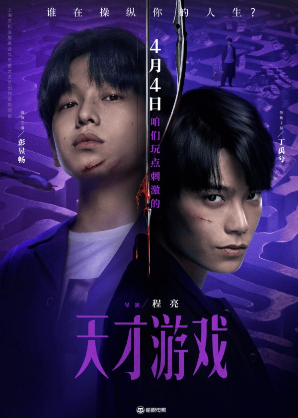 海报中一张滴血的弓箭悬于刘全龙(彭昱畅 饰)与陈伦(丁禹兮 饰)之间,两人面带血痕置身在幽暗的蓝紫色光影中,身影背后,是纸醉金迷的生活,也是错综复杂的迷宫。阴影之下,似乎有人默默伫立操纵一切,而有人已经倒在血泊之中。电影《天才游戏》由程亮导演,彭昱畅、丁禹兮领衔主演。