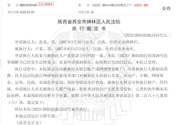 记者从中国裁判文书网查询到,《碑林区法院执行裁定书》【(2025)陕0103执5553号之二】显示,2025年12月15日,张某申请强制执行,被执行人卢某,标的暂计为202152元,本院已受理。