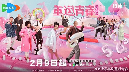 又如2月9日在腾讯视频独播的都市情景喜剧《重返青春》集结了李诚儒、许娣、蔡明、范明、梁天等中老年国民演员,由开心麻花团队与英达联合摄制,围绕6名大学生在养老社区实习并与老人成为“忘年交”的经历展开。