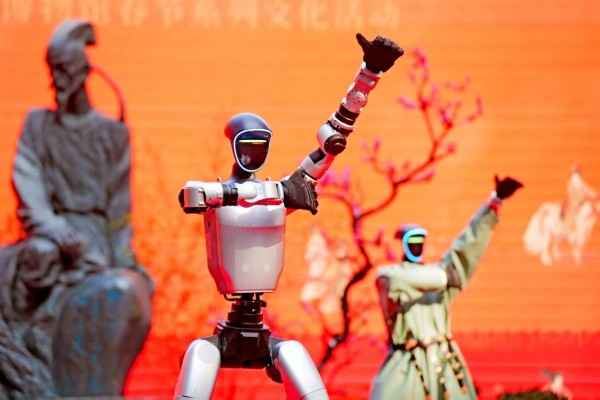 大雅堂前的舞台上,一组机器人在杜甫的“数字人”影像前翩翩起舞,引得观众们纷纷高举手机,争相拍摄视频;孩子们则围着长桌,现场挥毫书写春联。