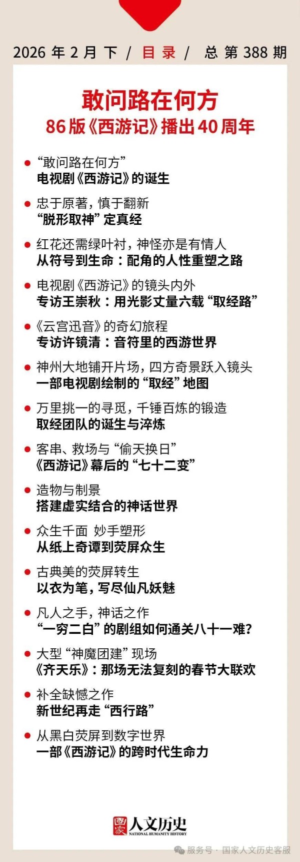 本期《国家人文历史》将通过多角度分析,深度探讨《西游记》如何在尊重原著的基础上进行创造性转化,又如何在娱乐性与思想性之间找到平衡,传递出超越时代的生命力。从1982到2026,这部用匠心与汗水铸就的经典,早已超越荧幕,成为照亮时代的精神灯火。(本期封面策划/周渝)