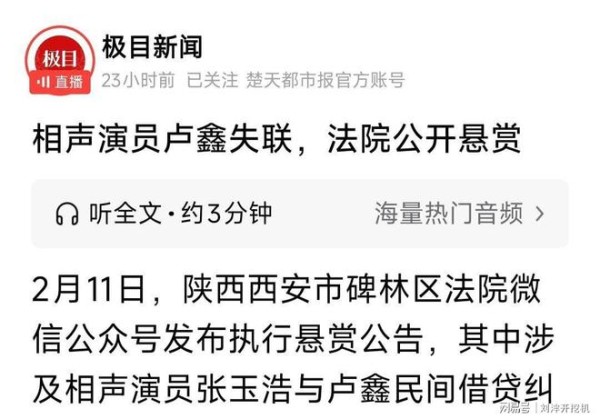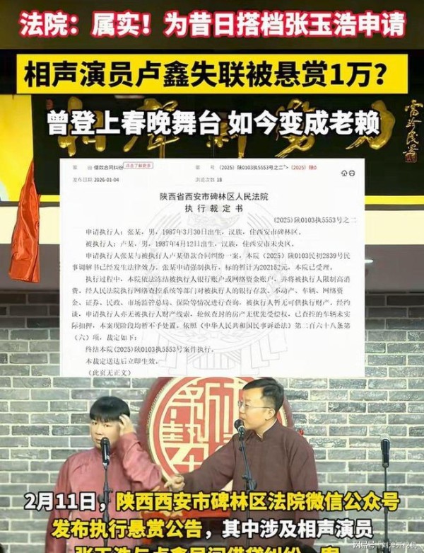 知名相声演员卢鑫失联被悬赏?法院:申请人是其搭档知名相声演员失联被悬赏?法院:属实