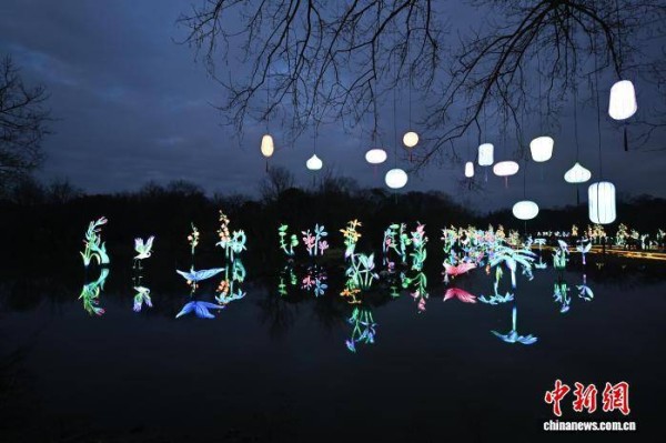 2月13日,游人欣赏水中花灯。近日,浙江杭州2026西溪灯会亮相,超千盏造型各异的花灯点亮水乡夜色,美轮美奂之景和浓郁年味吸引游人。中新社记者 王刚 摄
