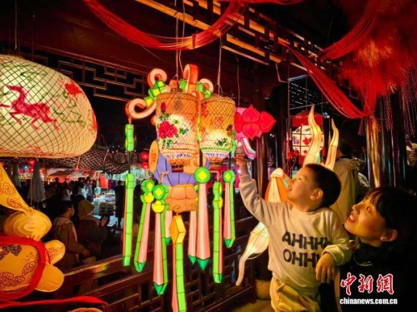 2月14日,龙马庙会人气十足。当日,上海蟠龙天地新春活动将传统年俗与江南水韵完美融合。非遗灯会璀璨点亮,水上鱼灯巡游如梦似幻,龙马庙会市集热闹非凡,为申城新春增添一抹别样的江南烟火气,吸引市民游客纷纷前来感受年味。中新社记者 汤彦俊 摄