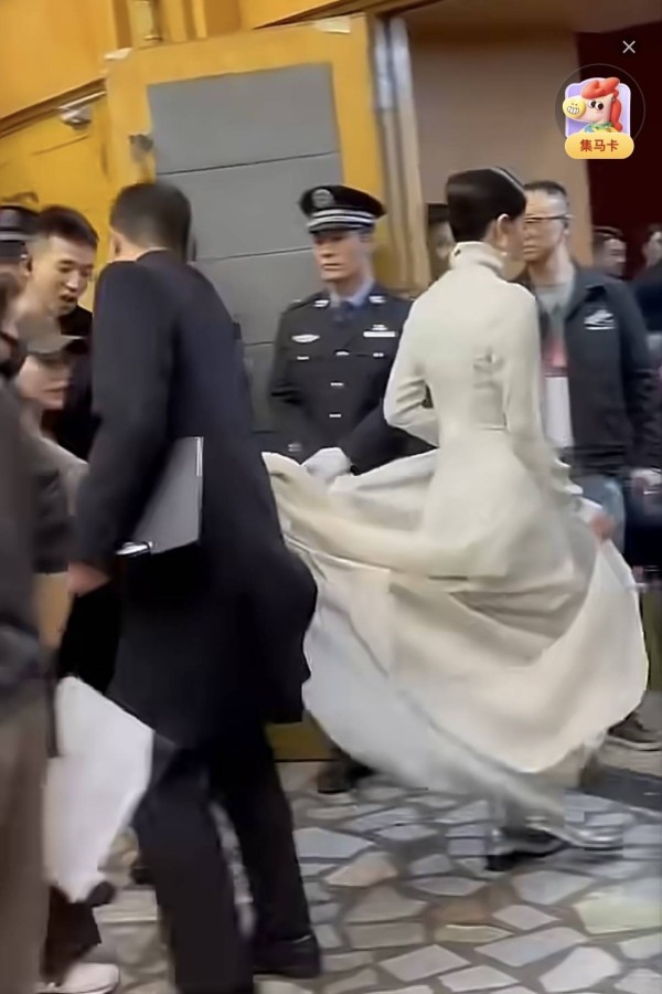 她穿白色修身呢大衣,内搭许是演出时的拖尾长裙,同样是白色系。拖尾款的设计,比去年的白裙更华丽繁杂了些。