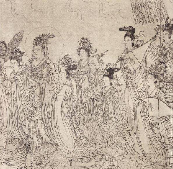 这幅画在构图上吸收了古典绘画的精髓,采用了散点透视手法,将87位神仙排列在同一视平线上,形成了强烈的空间感与节奏感。画中人物彼此交错,每个角色的布局都极为巧妙,虽然并非完整的形象呈现,却让整个画面充满了动感与层次感。值得一提的是,这幅画完全以线条为基础,运用了大量长线条来表现仙人的飘逸感,巧妙的长短、疏密变化使得人物与人物之间既相互联系又各具独立性。整个画面在万千线条的交织中展现出强大的生命力。画家采用了十八描中的多种精妙线描技法,如高古游丝描、铁线描等,充分发掘了线条的流动感,并将东方绘画对线条的把握发挥到了极致。