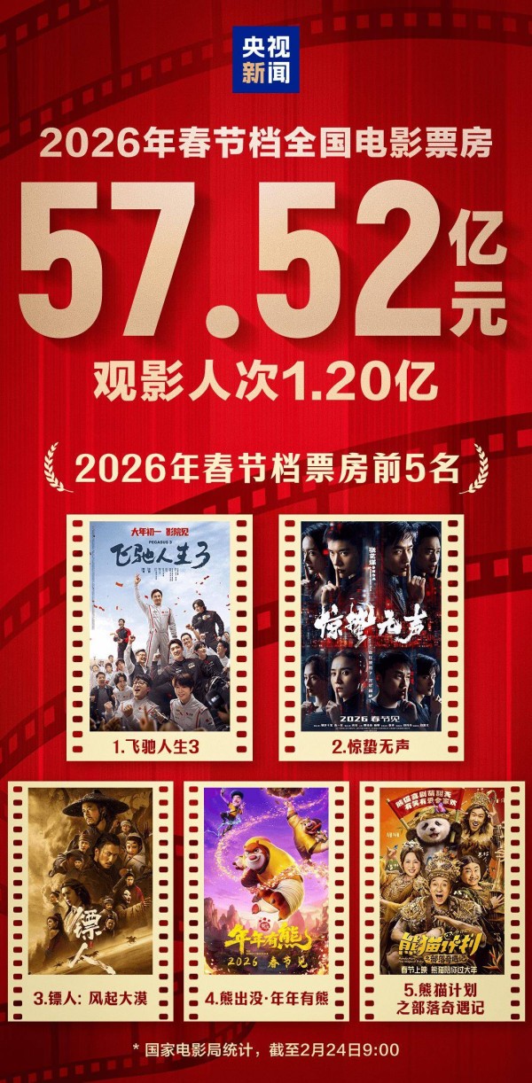2026春节档(2月15日-2月23日)落下帷幕,据国家电影局数据显示,截至2月24日9时,本届春节档总票房达57.52亿元,累计观影人次1.2亿。