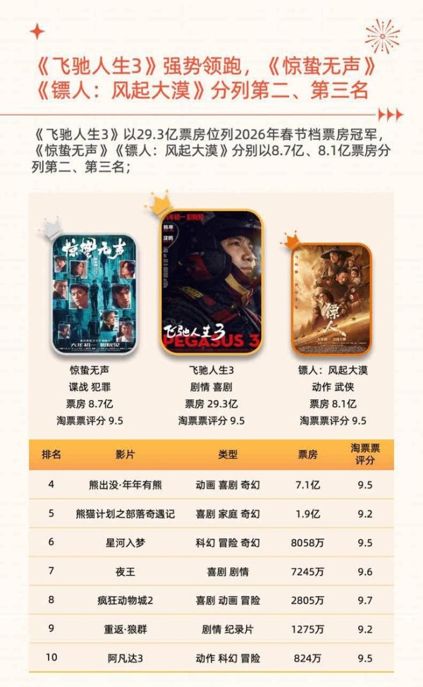 春节档57.52亿元收官!《飞驰人生3》夺冠无悬念《飞驰人生3》破1亿!吴京追不上了,2026年春节档冠军定了?