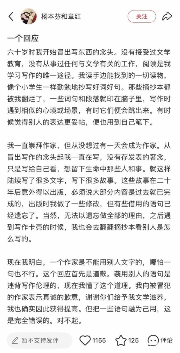 86岁作家杨本芬回应抄袭争议:“首先是道歉”杨本芬承认抄袭,发文道歉
