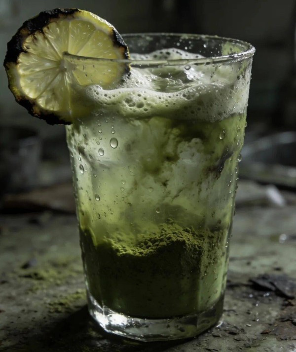 抹茶里的茶多酚遇到柠檬的酸性,会发生化学反应,颜色瞬间从翠绿变成暗黄、浑浊的土绿色。