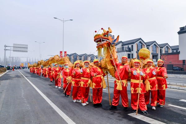 大兴区安定镇举办民俗表演活动,80米长的大龙队伍参加巡游。新京报记者 李木易 摄
