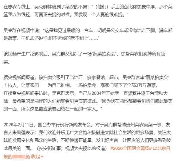 4日下午,全国人大代表、全国台联常务理事曾力群在驻地接受记者采访时表示:“吴克群视频的影响力非常非常大,让台湾同胞看到了祖国惠农利民的举措。台湾青年应亲身来感受祖国的美好。”
