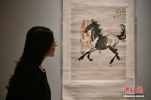 3月19日,香港故宫文化博物馆举行传媒预览活动,介绍将于20日开放予公众参观的“天马凌云——故宫博物院藏绘画珍品”专题展览。图为一名女士欣赏徐悲鸿的《双马图》。 中新网记者 李志华 摄