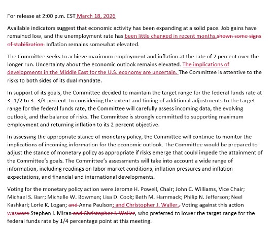 美联储官员如预期所料按兵不动,维持对今年降息一次的预期中值,同时承认中东战争导致不确定性增加。