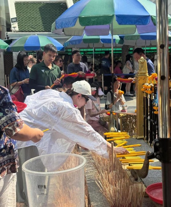 戚薇曼谷四面佛还愿,双手合十跪地上香很虔诚,李承铉满面不自在