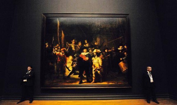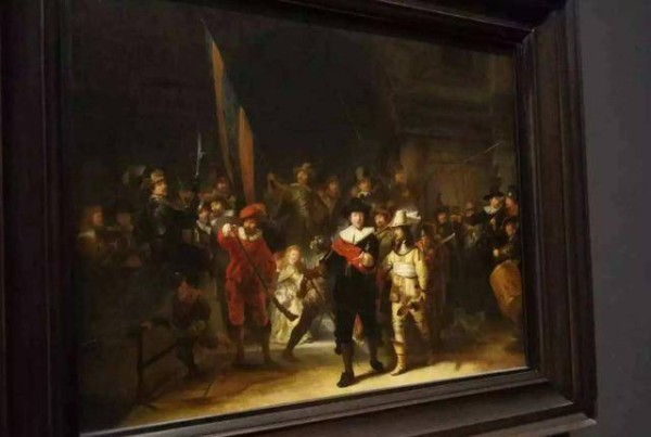 另一幅世界名画是《夜巡》,由荷兰画家伦勃朗·哈尔曼松·凡·莱因于1642年创作,现藏于阿姆斯特丹国立博物馆。画中描绘的是荷兰城市民兵正在巡逻的场景,他们在平时更类似现代的城管或联防队员。荷兰陆军经过一系列军事改革,在莫里斯的领导下取得多次对西班牙军队的胜利。《夜巡》完成后不久,因画作体积过大,雇主——射手队成员将周边裁掉以便挂在门厅,这也使得画面原本的平衡感受到破坏。更糟糕的是,当时大厅使用明火烧泥炭取暖,炭灰长期落在画布上,使色彩暗淡,甚至让人误以为画面描绘的是夜晚的巡逻,因而得名《夜巡》。此画后来一直被荷兰王室收藏,直到19世纪阿姆斯特丹国立博物馆建立后,才作为馆藏珍品对外展示。