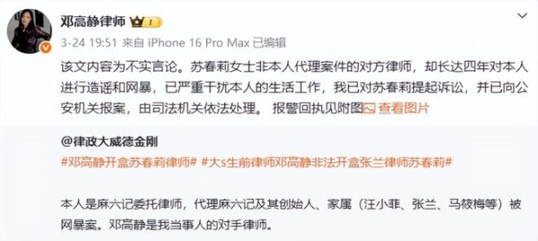 要知道,律师的隐私本就受法律保护,随意侵犯他人隐私本就是违法行为,这般毫无底线的操作,也引来了网友们的一致谴责。可就在汪家律师发声后不久,S家也正式发威,大S生前的代理律师邓高静迅速发文回应,直言汪家律师的说法都是不实言论,还表示自己也已经向警方报案,网友们调侃的“报告帽子叔叔”,也真的变成了现实。