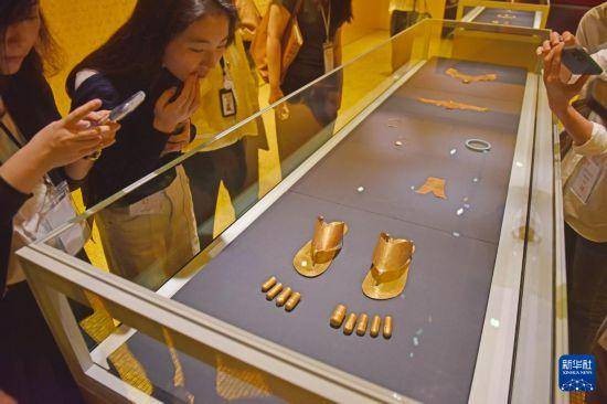 4月14日,媒体记者在参观埃及脚趾套和拖鞋。
