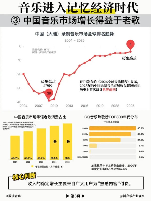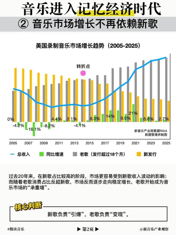 从数据上看,过去20年来,在新歌占比较高的阶段,市场更容易受到新歌收入波动的影响;而随着老歌消费占比反超新歌,市场反而逐步走向稳定增长,老歌开始成为音乐市场的“承重墙”。