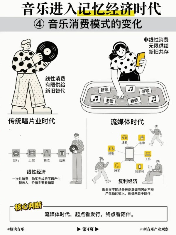 这一现象常常被解读为“青黄不接”或者“新不如旧”,但从某种意义上说,这也是音乐在非线性经济逻辑下的价值回归:毕竟,音乐的核心价值在于“陪伴”,而非“创新”。
