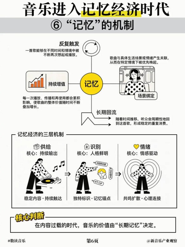 音乐的价值评估标准随之发生变化,尽管“注意力法则”仍然有效,但边际效益在快速递减,新歌越来越难以占据听众心智;相反,那些具有更高记忆价值的作品,不但持续获得分配优势,还能构建出更大的消费空间。