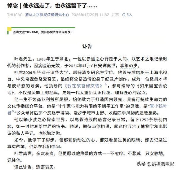 据清华大学影视传播研究中心发布的消息,影视界传出令人遗憾的消息。曾拍出多部高分纪录片、参与执导大热纪录片《我在故宫修文物》的导演叶君,因病医治无效安详离世,年仅43岁。