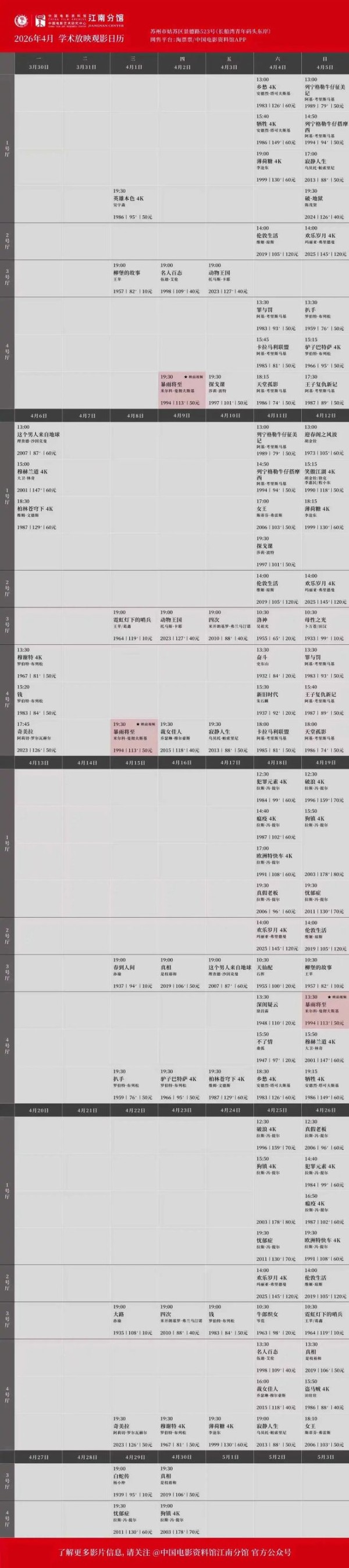 苏州江南分馆今日正常放映。4月27日公布5月片单,29号开票。五一五天乐,敬请期待。北京5月放映将在4月28日公布,30日开票。北影节结束后,小西天艺术影院进入北京大学生电影节展映环节,一直将持续放映至5月4日,优惠票价10元一场。
